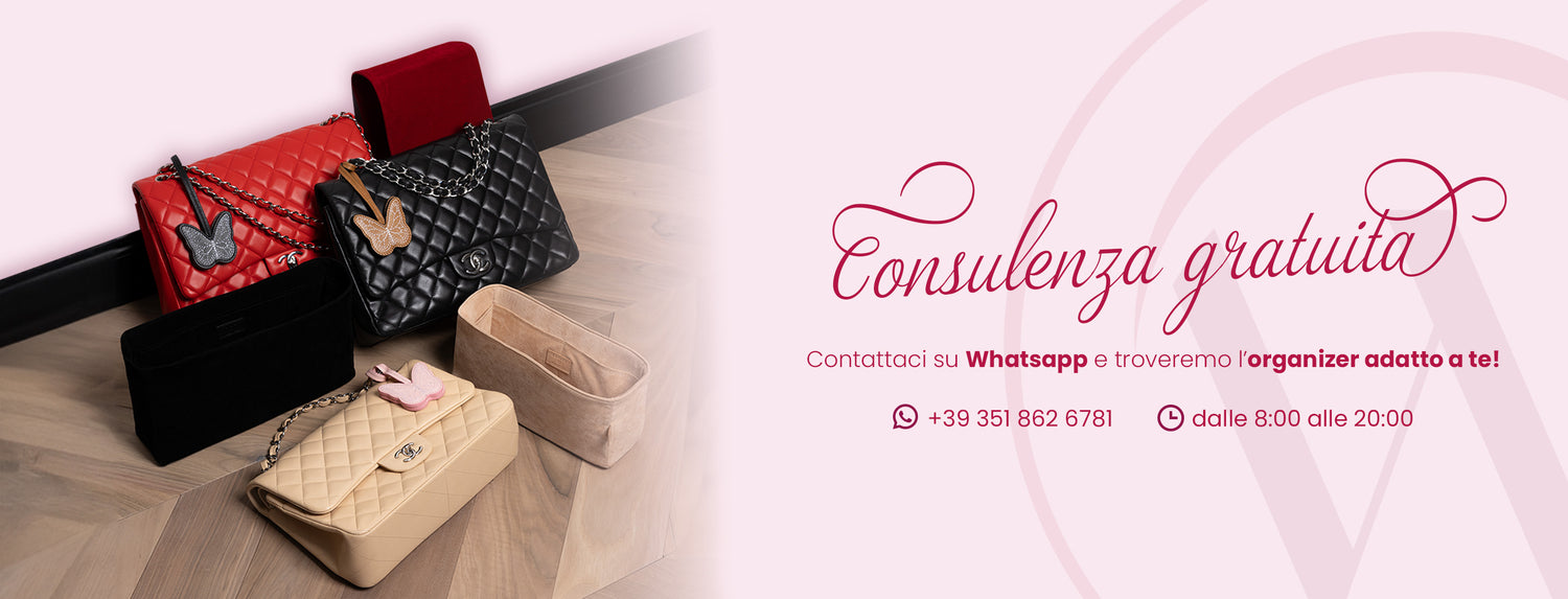 Con il nostro servizio gratuito di consulenza su WhatsApp, ti guideremo nella scelta dell’organizer più adatto al modello e alle dimensioni della tua borsa.